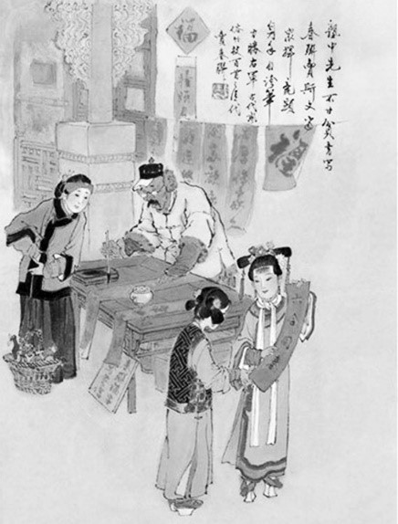 “买卖对联”,王弘力画《古代风俗百图》