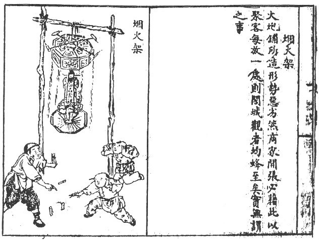 下图选自傅崇矩《成都通览》(1909~1910年印),题目是“烟火架”,图上的说明称:“火炮铺所造,形势恶劣。然商家开张,必藉此以聚客。每放一处,则阖城观者,均蜂至矣。实无谓之事。”我们可以看到,傅崇矩对放火炮很不赞同,透露了改良者对许多传统习惯的批评态度。