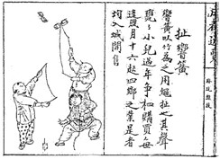 扯响簧是过去春节儿童最喜欢的玩具之一,直到20世纪60年代仍然十分流行,可惜今天一般只有杂技演员用作表演了。据《成都通览》:“响簧以竹为之,用绳扯之,其声甕甕。小儿过年,争相购买。每逢腊月十六日起,四乡之业是者,均入城开售。”这里也说明此类物品,大多由乡村农户制作,然后入城销售,从一个侧面反映了城乡的依赖关系。