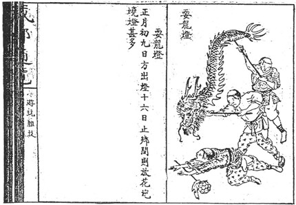 灯会中最热闹的是耍“龙灯”,又称“烧灯”。下图来自《成都通览》,图中说明称:“正月初九日方出灯,十六日止。乡间则放花炮,烧灯甚多。”这些龙灯用彩色的长布做成,有头有尾,由两人舞狮,十余人舞龙。随着爆竹声进行的表演总是吸引人山人海般的观众,他们从一条街到另一条,所经之处,观众投钱以示嘉奖,这个表演一般持续至半夜。