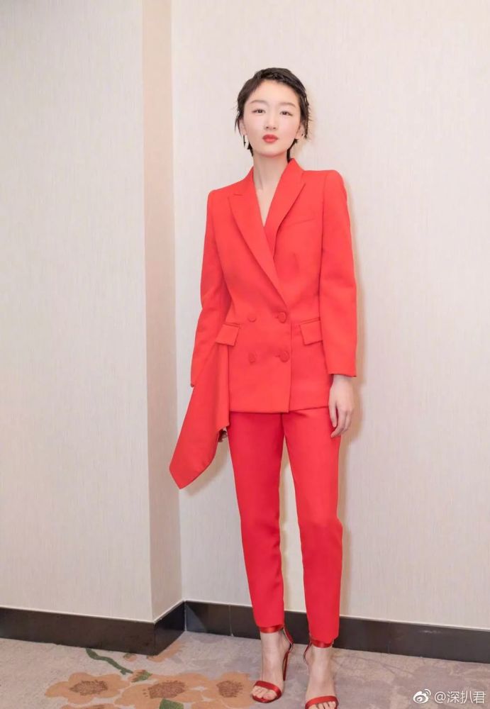 灵动娇小的周冬雨,选择的红西装来自于Alexander McQueen,双排扣设计复古优雅,不对称的口袋设计则个性十足,很能衬托出她的“精灵感”。