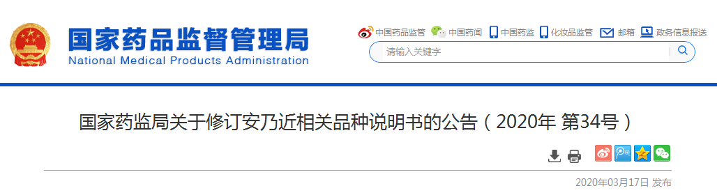 为进一步保障公众用药安全,国家药品监督管理局决定对安乃近片、重感灵片、重感灵胶囊、复方青蒿安乃近片说明书【不良反应】、【注意事项】等项进行修订。现将有关事项公告如下:一、所有安乃近片、重感灵片、重感灵胶囊、复方青蒿安乃近片生产企业均应依据《药品注册管理办法》等有关规定,按照安乃近片、重感灵片、重感灵胶囊、复方青蒿安乃近片说明书修订要求(见附件),提出修订说明书的补充申请,于2020年6月12日前报省级药品监管部门备案。