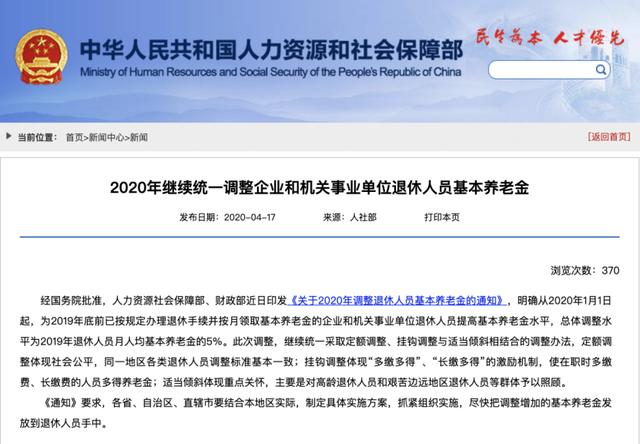4月17日,人社部、财政部印发《关于2020年调整退休人员基本养老金的通知》,明确从2020年1月1日起,为2019年底前已按规定办理退休手续并按月领取基本养老金的企业和机关事业单位退休人员提高基本养老金水平,总体调整水平为2019年退休人员月人均基本养老金的5%。