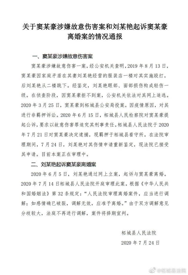近日,河南商丘的刘女士称,自己2019年8月遭丈夫窦某豪家暴后跳楼,至今没能离婚,引发关注。24日晚,河南省商丘市柘城县法院通报: