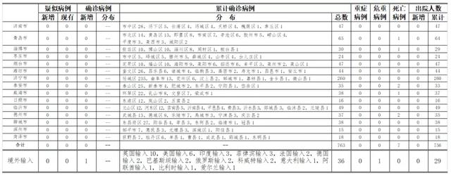 山东无新增境外输入疑似病例,青岛市报告菲律宾输入确诊病例1例。累计报告境外输入确诊病例36例(其中,危重病例1例),累计治愈出院29例。