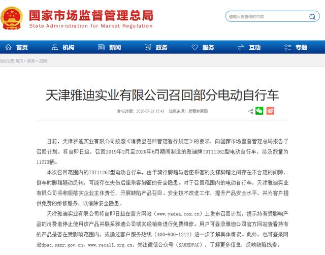 日前,天津雅迪实业有限公司按照《消费品召回管理暂行规定》的要求,向国家市场监督管理总局报告了召回计划,将自即日起,召回2019年2月至2020年6月期间制造的雅迪牌TDT1126Z型电动自行车,涉及数量为11273辆。