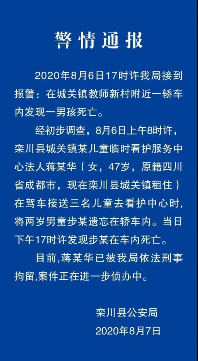 经初步调查,8月6日上午,栾川县城关镇某儿童临时看护服务中心法人蒋某华在驾车接送三名儿童去看护中心时,将两岁男童步某遗忘在轿车内。