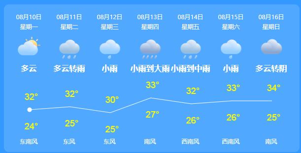 10日白天到夜间,多云间阴,局部地区有雷雨或阵雨,今天早晨到上午有雾或轻雾,东到东南风2~3级,气温32~25℃;