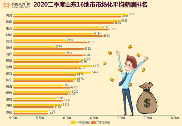 根据某人才网站统计的数据显示,2020年二季度,山东省平均薪酬为6450元,创下历史新高,有13个城市的平均薪酬高于6K。