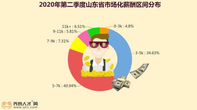 该网站还统计了山东的薪酬区间分布,数据显示,第二季度山东薪酬分布最多的区间是5-7K,占比达到40.94%,工资水平在3-5K的则占到了34.63%,是占比第二区的区间。