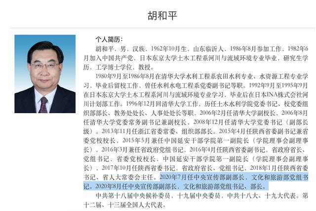 政知君注意到,近日,文旅部更新了官网,根据官网发布的简历显示,胡和平已于今年7月履新中央宣传部副部长。