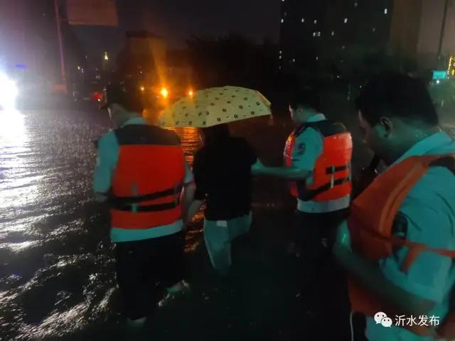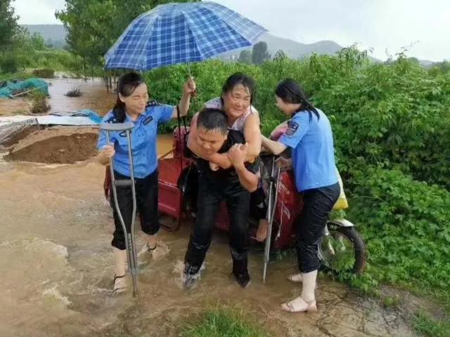 沂南双堠派出所的民警们转移受困的87岁老人。
