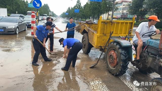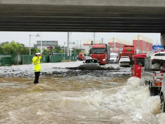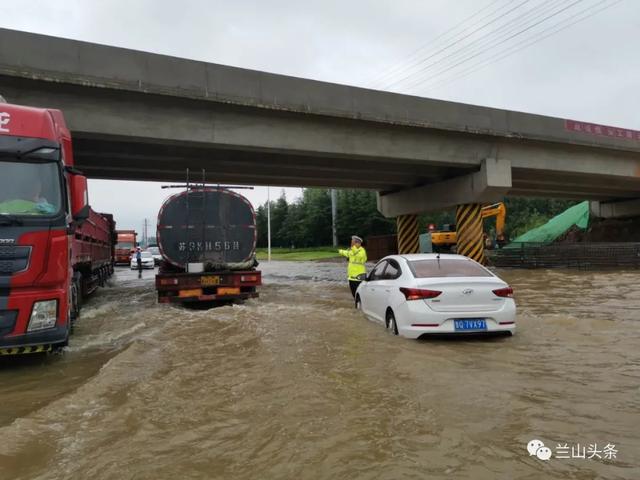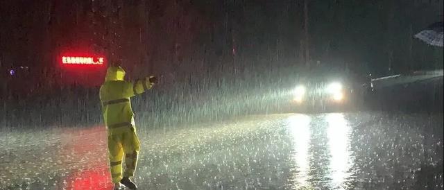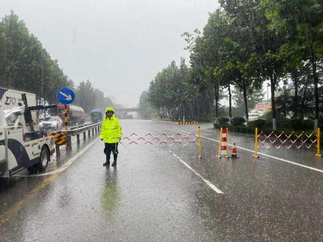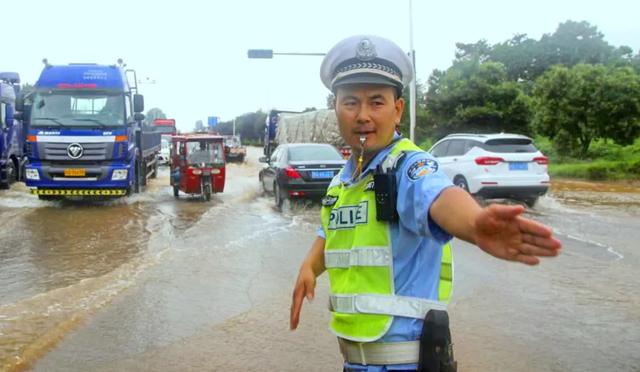 市公安局交通警察支队直属三大队汪沟中队的队员正在文泗积水路段疏通交通。