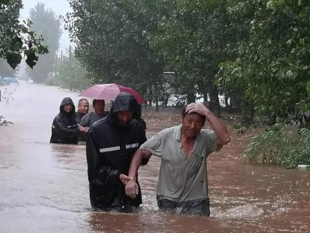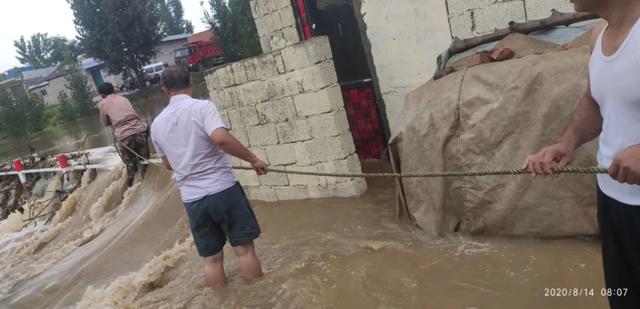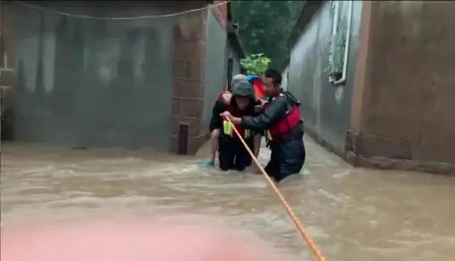大店镇彭家仕沟村,强降雨导致洪水涌入村庄,消防员洪水中用绳索转移被困人员。
