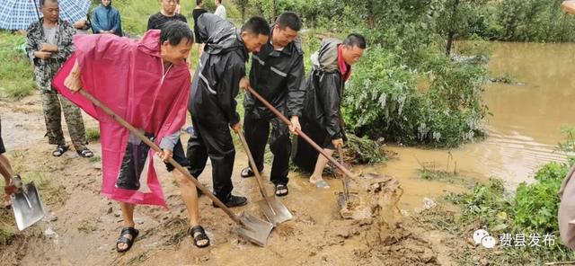 沂南县蒲汪镇党员干部接力筑堤坝。
