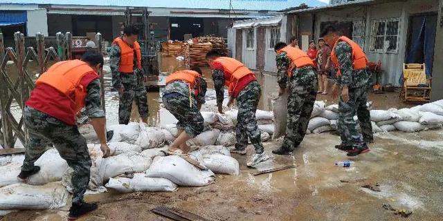 莒南县道口镇砖疃村全村上阵,装沙袋封闸抗洪。