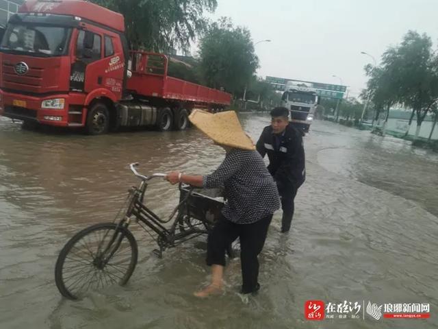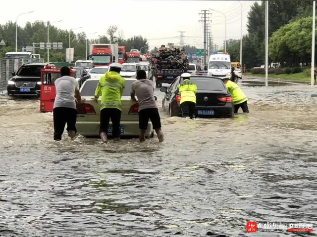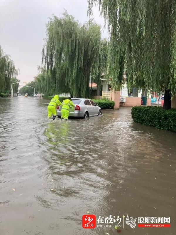 ——8月14日,兰山区汪沟镇城管中队一分队巡逻至大柳汪村路段,遇有一辆白色轿车因积水太深车辆熄火,城管队员立即下车帮忙。