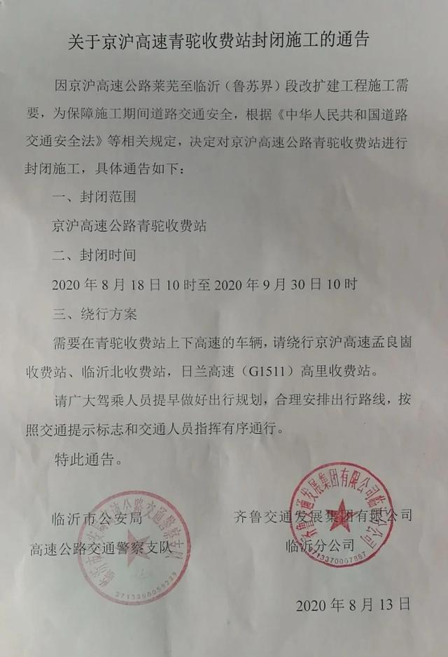 因京沪高速公路莱芜至临沂(鲁苏界)段改扩建工程需要,根据《中华人民共和国道路交通安全法》等相关规定,决定对京沪高速公路青驼收费站进行封闭施工,通告如下: