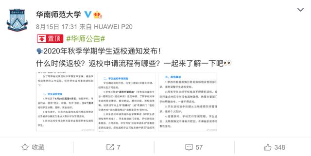 8月15日,@华南师范大学 发布通知称,秋季学期的返校时间为8月20日起至9月初,分6个批次组织学生分期、错峰、安全返校。身在境外、14天内有国内高风险地区旅居史以及被评估确定为重点人群的学生暂缓返校。