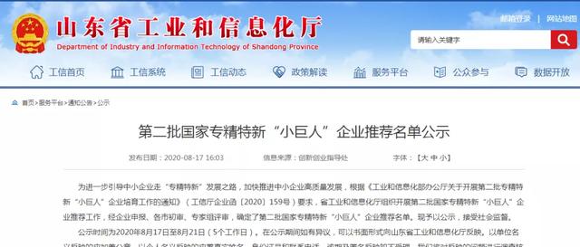 公示时间为2020年8月17日至8月21日(5个工作日)。在公示期间如有异议,可以书面形式向山东省工业和信息化厅反映。以单位名义反映的应加盖公章,以个人名义反映的应署真实姓名、身份证号和联系电话,逾期及匿名反映恕不受理。我们将对反映的问题进行调查核实处理,并为反映人保密。反映情况的书面意见请于2020年8月21日前通过邮递、传真或电子邮件(扫描件)送达。