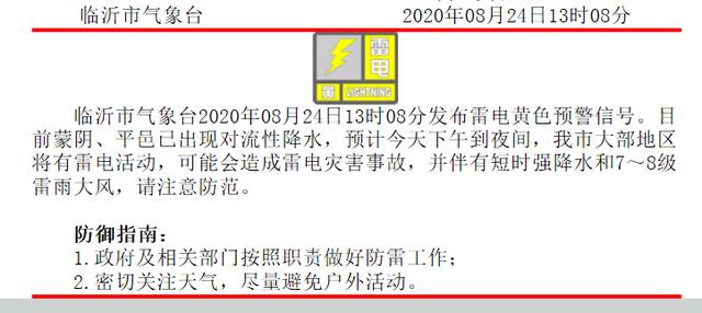 临沂市气象台2020年08月24日13时08分发布雷电黄色预警信号: