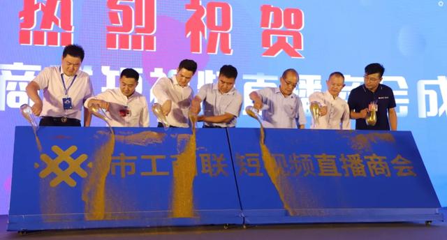 兰山商城管委会产业发展部主任杜庆明、兰华集团党委书记兼董事长曹继廉、市工商联短视频直播商会会长刘义林、执行会长杜滨、副会长盛鲁杰、宋建、刘建军上台为市工商联短视频直播商会的成立开启鎏沙仪式。伴随着金沙的缓缓飘落,市工商联短视频直播商会宣告正式成立!