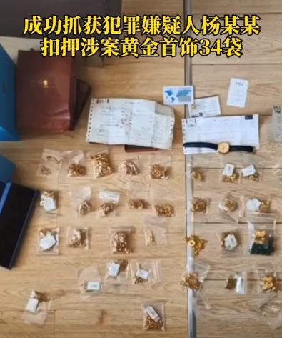 8月15日,由经开区分局精干警力,转战河北省秦皇岛市、黑龙江省大庆市和济南市等地,长途奔袭3000多公里,在当地警方的配合下,于8月20日,成功将犯罪嫌疑人杨某某抓获,扣押涉案黄金首饰34袋。