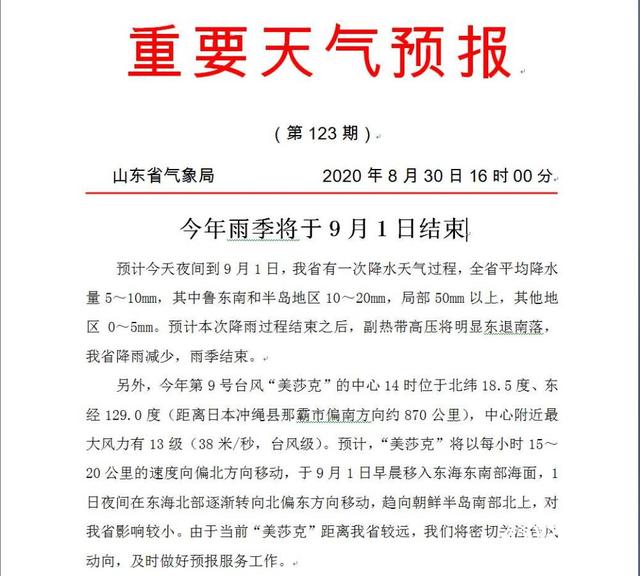 齐鲁网·闪电新闻8月30日讯 山东省气象台今天发布重要天气预报,今年雨季将于9月1日结束。预计今天夜间到9月1日,山东有一次降水天气过程,全省平均降水量5~10mm,其中鲁东南和半岛地区10~20mm,局部50mm以上,其他地区0~5mm。预计本次降雨过程结束之后,副热带高压将明显东退南落,山东降雨减少,雨季结束。