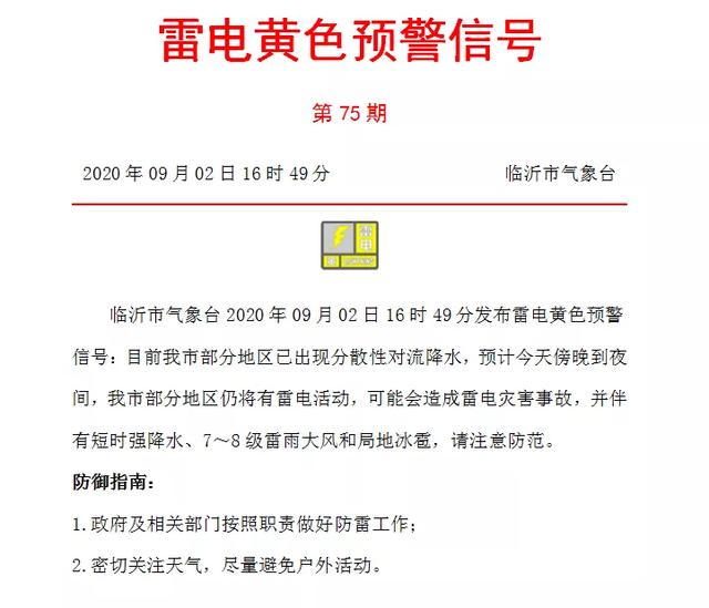 临沂市气象台2020年09月02日16时49分发布雷电黄色预警信号:目前我市部分地区已出现分散性对流降水,预计9月2日傍晚到夜间,我市部分地区仍将有雷电活动,可能会造成雷电灾害事故,并伴有短时强降水、7~8级雷雨大风和局地冰雹,请注意防范。
