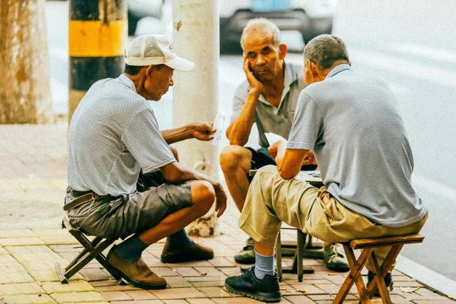 在车水马龙的路边,三位老大爷摆了个小桌子在打扑克牌,任周围人声鼎沸却丝毫不为打扰。