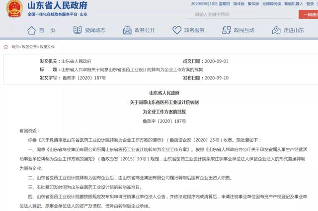 你委《关于恳请审批山东省医药工业设计院转制为企业工作方案的请示》(鲁国资企改〔2020〕25号)收悉。现批复如下: