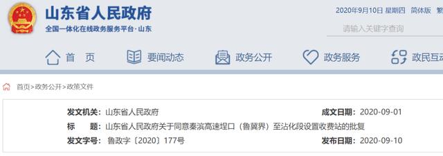 同意秦滨高速埕口(鲁冀界)至沾化段设置4处收费站,分别为:无棣埕口、滨港、无棣西小王、沾化北。收费期限25年。具体收费标准和起止时间由省政府有关部门核定后另行公布执行。