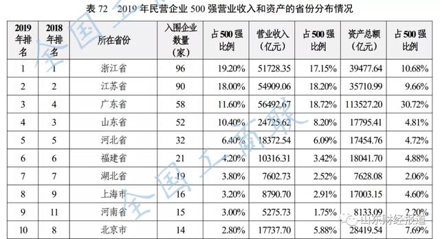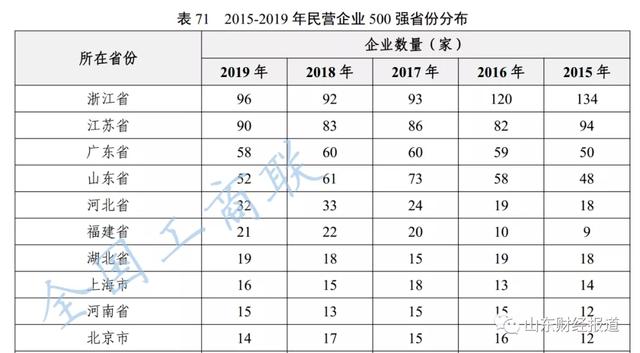 2015-2019年民营企业500强前10省份分布