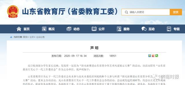 9月17日,山东省教育厅发布声明,称近日收到部分学生家长反映,发现有一冠名为“阳光新赛道山东省青少年艺术风采展示大赛”的活动,该活动冒用“山东省教育厅关心下一代工作委员会”作为主办单位。