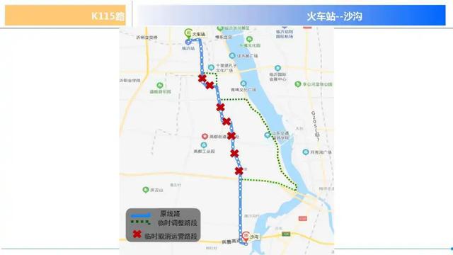K115路由沙沟运行至火车站,线路主要途经陶然路、沂州路、南大路、临时调整后线路将临时取消沂州路(沂州路至寇家对河路段)、南大路(湖北路至南环路路段)运营,临时调整至沂河路(沂州路至中丘路路段)、中丘路(沂河路至湖北路路段)、湖北路(南大路至滨河西路路段)、滨河西路(湖北路至南环路路段)、南环路(滨河西路至南大路路段)运营,临时取消停靠公交站点19处:鲁南花卉市场、粮油市场、寇对河、花木博览城、维也纳小区、加油站、东高都、后坦村、后坦小区、车辋村、程庄、程庄供电所、瑞恩幼儿园、塘崖、薛庄幼儿园、大塘崖幼儿园、塘崖南、塘崖路口、外环路口。