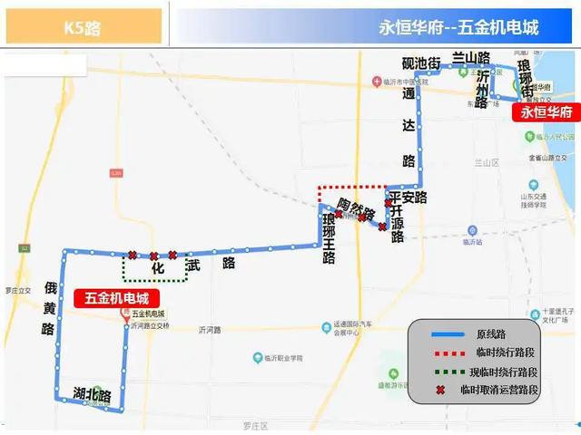 K5路由永恒华府运行至五金机电城,线路主要途经沂州路、兰山路、砚池街、通达路、平安路、开源路、陶然路、琅琊王路、化武路、俄黄路、湖北路,线路调整后将取消化武路路段的运营,临时调整至罗八路、金七路、化武路恢复原线路运营,取消停靠站点3处:齐庄西、外环路口、金属物流城。
