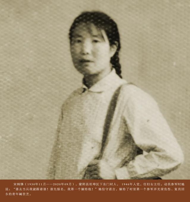 宋炳锋, 1930年11月出生,1946年3月加入中国共产党,在村里先后担任过识字班班长、妇救会长。73年前,宋炳锋毅然喊出:“谁第一个报名参军,俺就嫁给谁!”