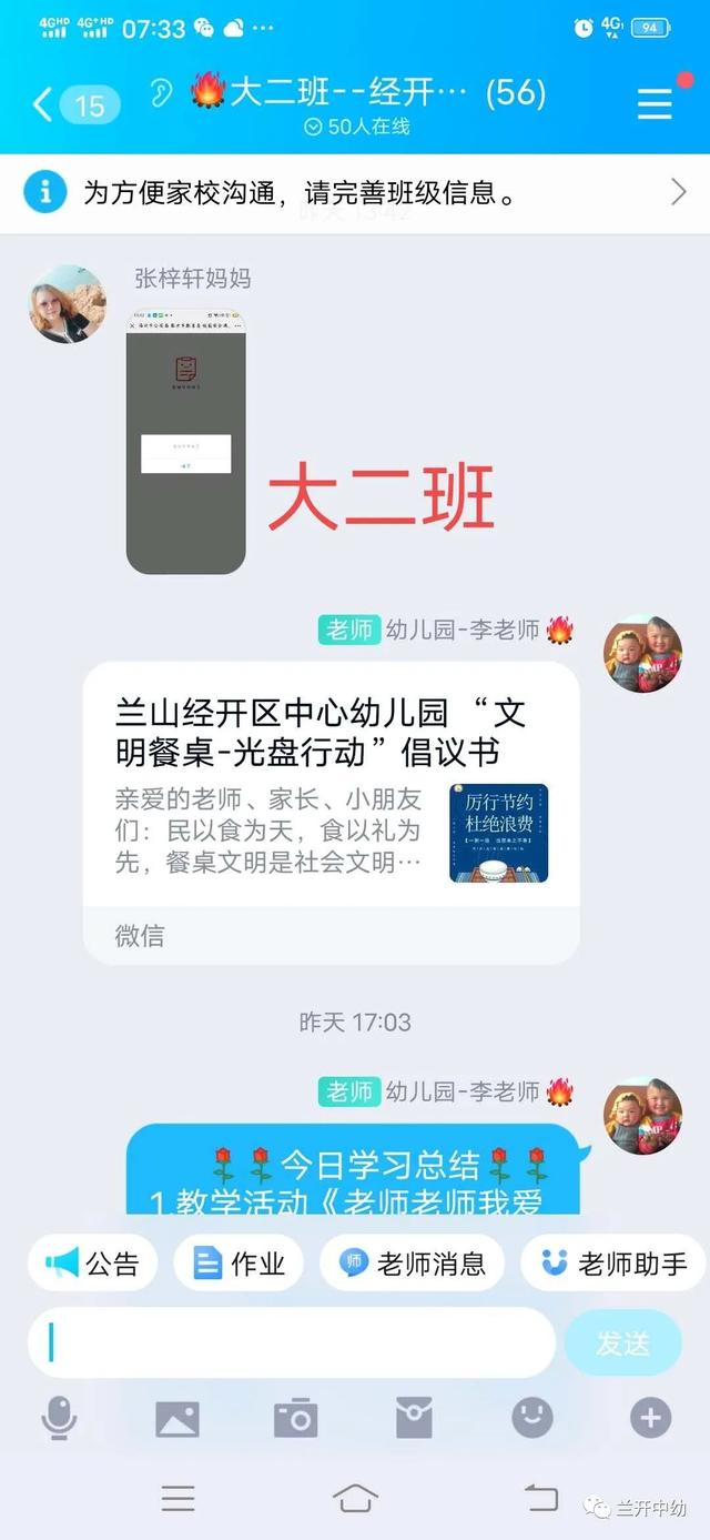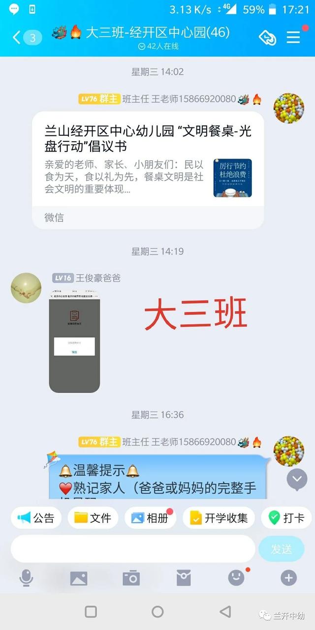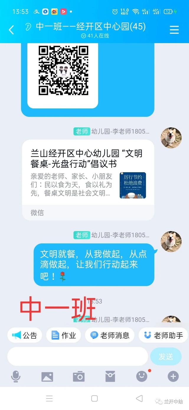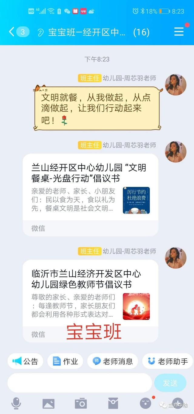 以幼儿带动整个家庭,小手拉大手,教师通过班级群向家长朋友宣传“光盘行动”, 相互监督,相互提醒,号召每一个家庭做“光盘行动”的宣传者和践行者。