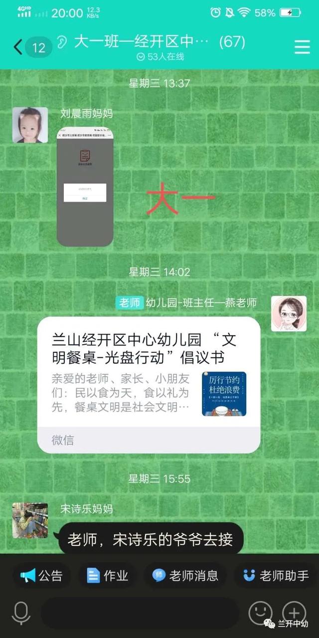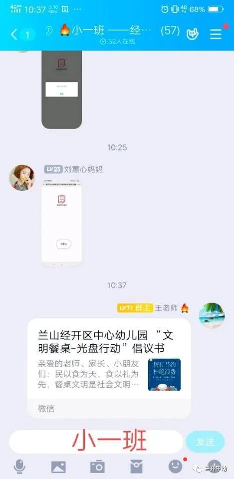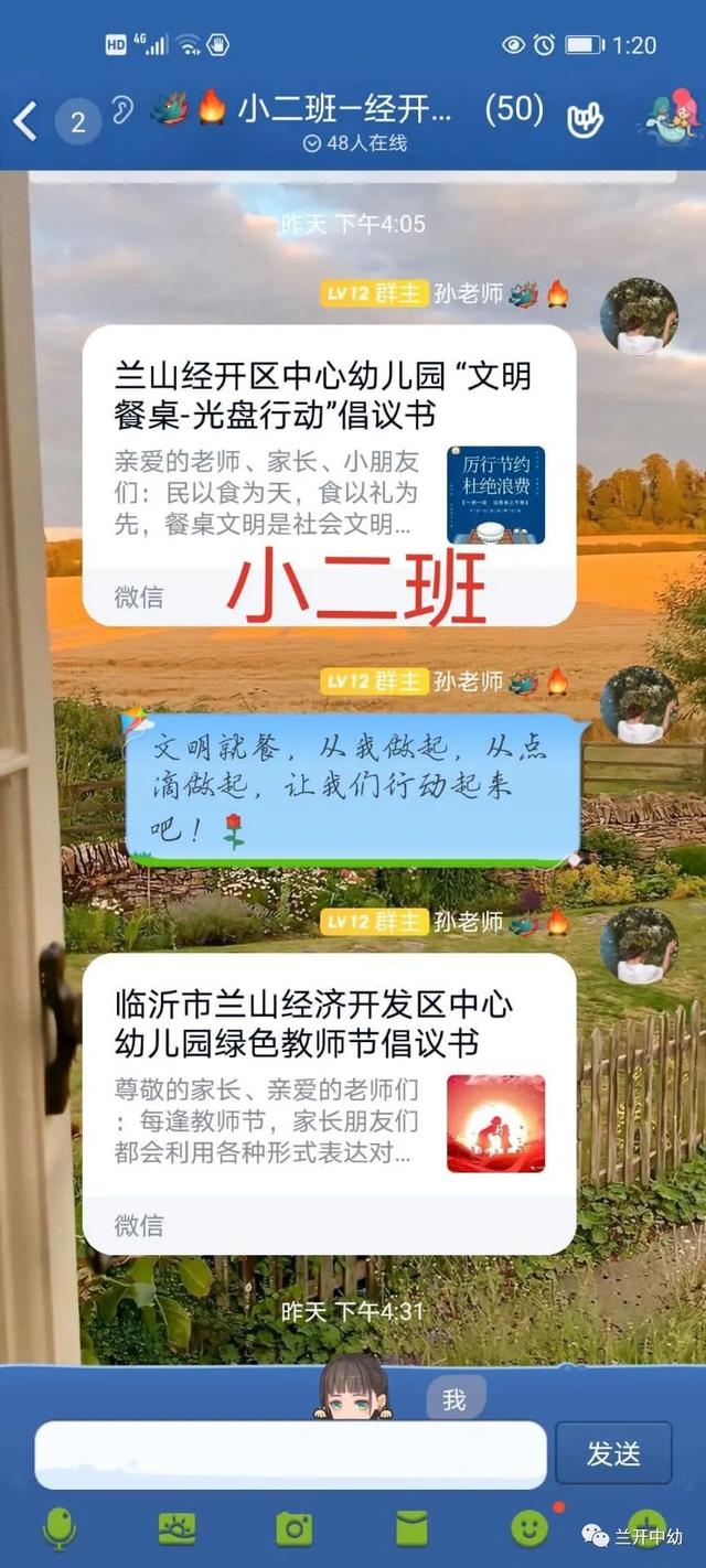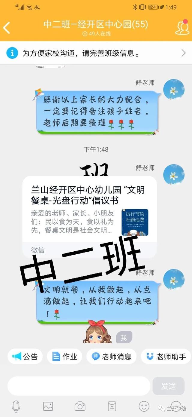 以幼儿带动整个家庭,小手拉大手,教师通过班级群向家长朋友宣传“光盘行动”, 相互监督,相互提醒,号召每一个家庭做“光盘行动”的宣传者和践行者。