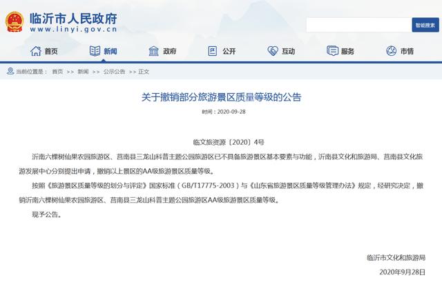 按照《旅游景区质量等级的划分与评定》国家标准(GB/T17775-2003)与《山东省旅游景区质量等级管理办法》规定,经研究决定,撤销沂南六棵树仙果农园旅游区、莒南县三龙山科普主题公园旅游区AA级旅游景区质量等级。
