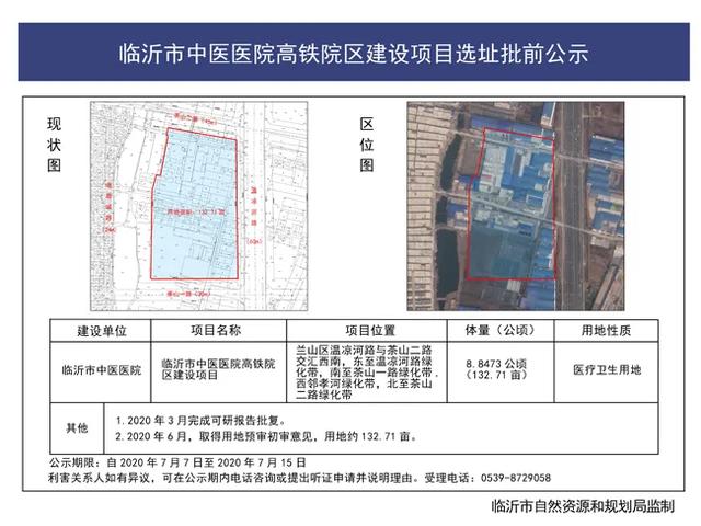 此前,临沂市自然资源和规划局发布临沂市中医医院高铁院区建设项目选址批前公示。