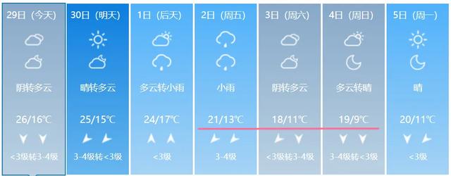 今天白天到夜间,阴转多云,东到东北风2~3级,气温26~16℃;