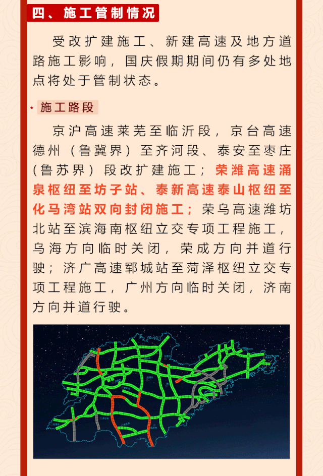 目前,除京台高速馒寿山段、潍日高速大瓮山隧道路段经专家评定不具备恢复设计速度条件以外,京台、沈海、长深、荣乌、济广、青新、滨莱、威青、蓬栖、日兰、泰新、济南绕城12条高速公路,17处路段恢复至设计速度。