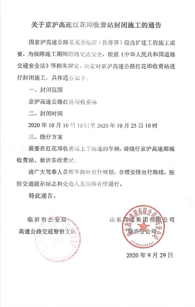 因京沪高速公路莱芜至临沂(鲁苏界)段改扩建工程施工需要,为保障施工期间道路交通安全,根据《中华人民共和国道路交通安全法》等相关规定,决定对京沪高速公路红花埠收费站进行封闭施工,具体通告如下: