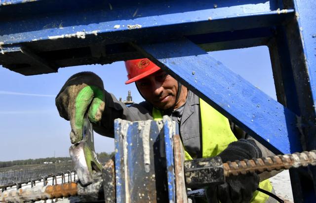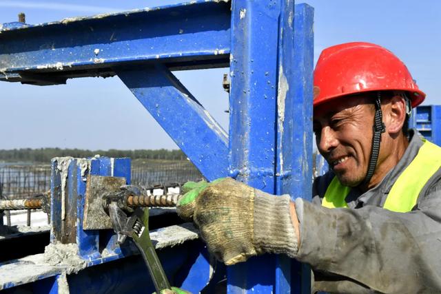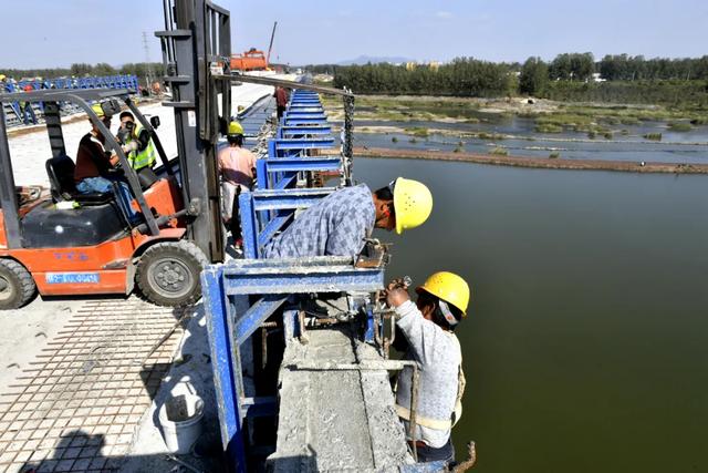 记者在岚山至罗庄高速公路沭河桥路段施工现场看到