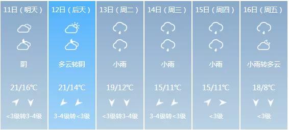 11日夜间到12日白天,阴局部地区有小雨转多云,东北风3~4级,气温15~22℃;