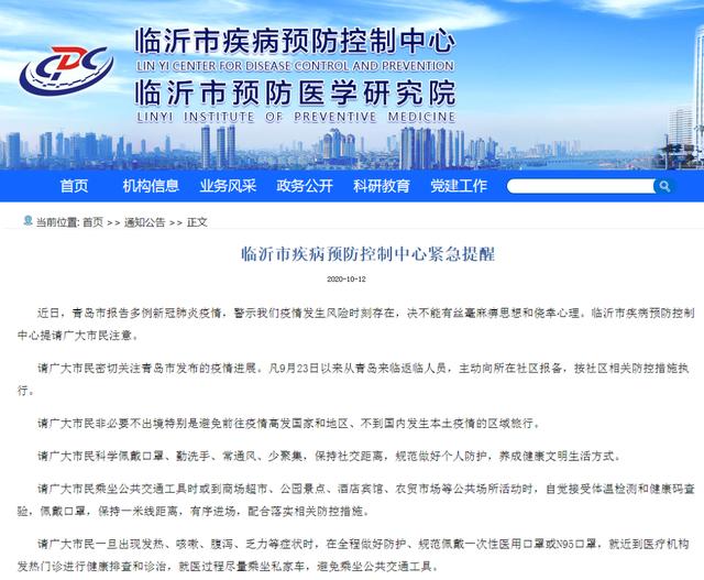 近日,青岛市报告多例新冠肺炎疫情,警示我们疫情发生风险时刻存在,决不能有丝毫麻痹思想和侥幸心理。临沂市疾病预防控制中心提请广大市民注意。