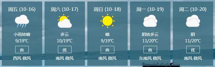15日白天到夜间,多云转阴,大部地区有小雨,偏东风3级,气温18~13℃。