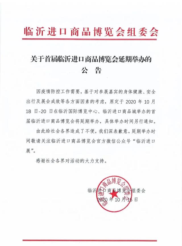 因疫情防控工作需要,基于对参展嘉宾的身体健康、安全出行及展会成效等各方面因素的考虑,经研究决定,原定于2020年10月18日-20日在临沂国际博览中心、临沂进口商品城举办的首届临沂进口商品博览会将延期举办,具体举办时间另行通知。