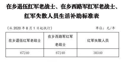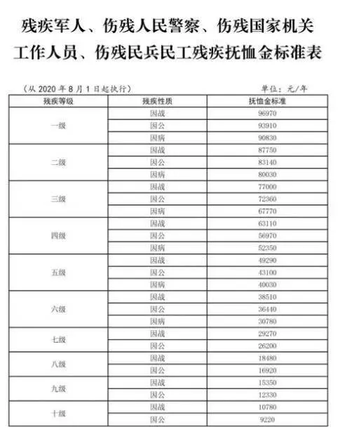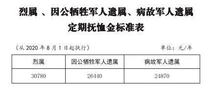 提高残疾军人(含伤残人民警察、伤残国家机关工作人员、伤残民兵民工)的残疾抚恤金、烈属(含因公牺牲军人遗属、病故军人遗属)的定期抚恤金、在乡退伍红军老战士(含在乡西路军红军老战士、红军失散人员)的生活补助标准。其中,一级因战、因公、因病残疾军人抚恤金标准分别为每人每年96970元、93910元、90830元,烈属为每人每年30780元,因公牺牲军人遗属为每人每年26440元,病故军人遗属为每人每年24870元。